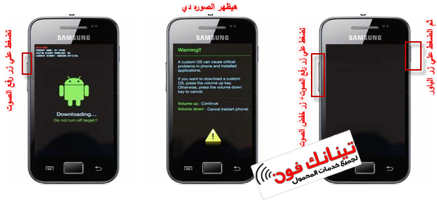 - نقوم بالدخول لوضع Download mode وذلك بالضغط علي زر رفع الصوت +خفض الصوت في وقت واحد ثم الضغط علي الباور كالاتي:
